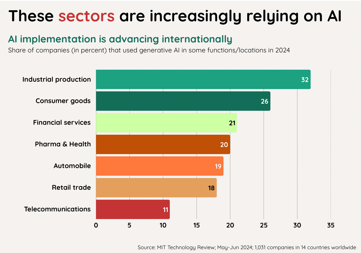 The results of the MIT Technology Review study show how differently AI is already being used in individual industries. In 2024, industrial production will be clearly ahead with 32 percent.