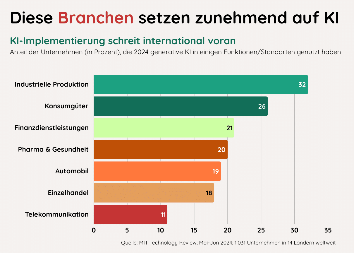 Die Studienergebnisse der MIT Technology Review zeigen, wie unterschiedlich stark KI in den einzelnen Branchen bereits eingesetzt wird. 2024 liegt die industrielle Produktion mit 32 Prozent klar vorne.