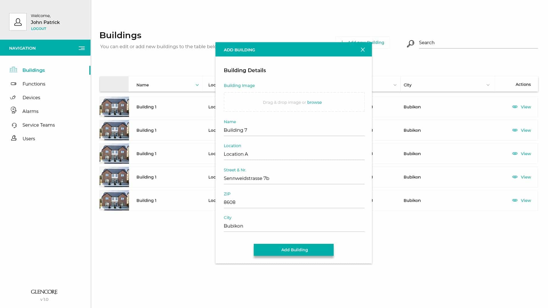 Das Ziel war die Entwicklung einer zentralen Plattform zur Verwaltung aller Gebäude. Die neue Webapp ermöglicht es, Hauptgebäude zu erfassen und alle Geräte innerhalb dieser Gebäude zu verwalten. Jedes Gerät kann mit wichtigen Informationen wie Service- und Wartungsterminen verknüpft werden.