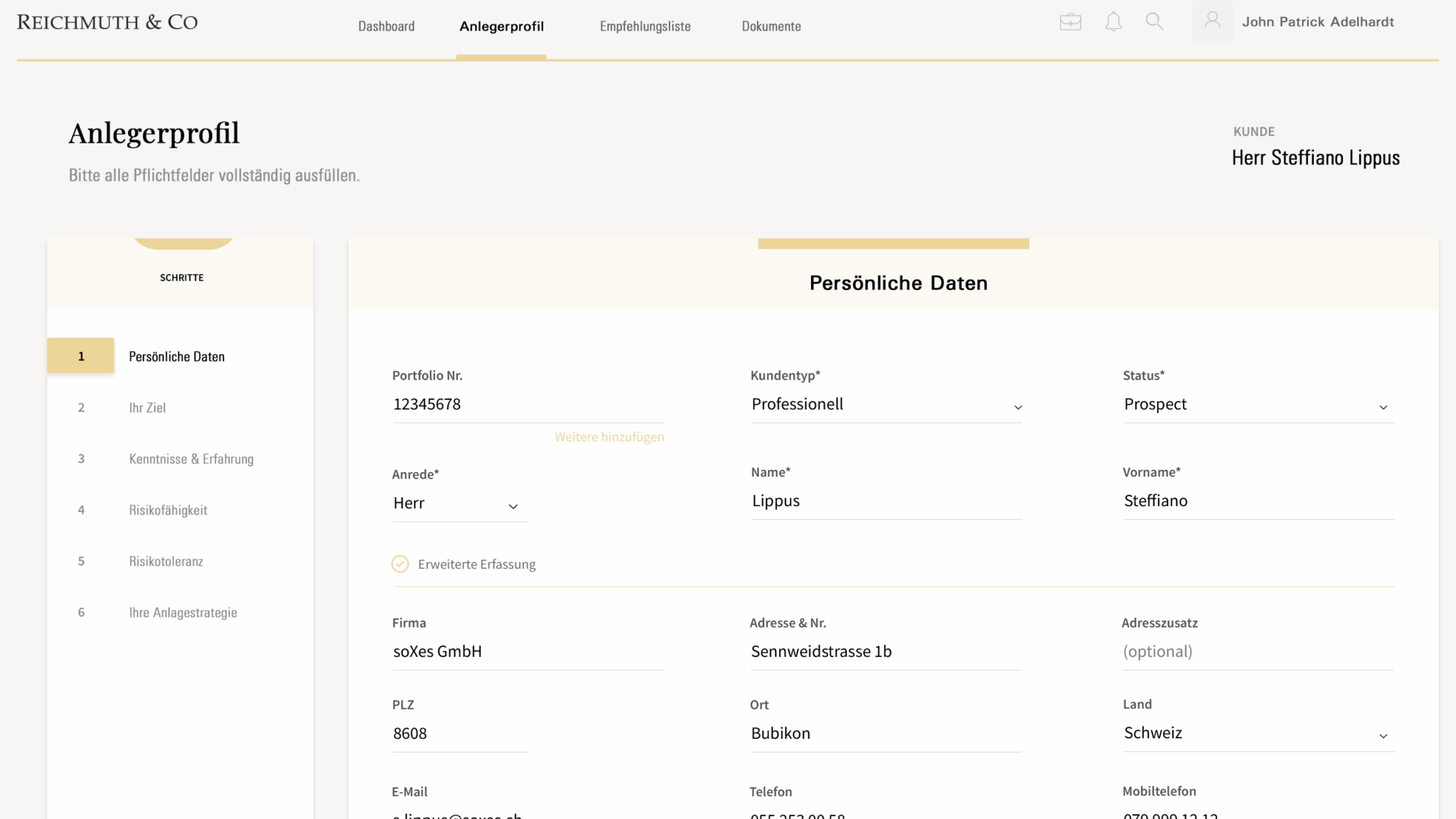 Um den aktuellen und sich ständig ändernden Anforderungen in der Finanzbranche gerecht zu werden, wollte Reichmuth & Co. seine Prozesse digitalisieren. Zu diesem Zweck beauftragte sie soxes mit der Entwicklung eines Beratungstools, das alle internen und externen Prozesse abdeckt. Das Tool soll sowohl den Aufwand für die Mitarbeiter als auch die Menge der physisch abzulegenden Dokumente reduzieren.
